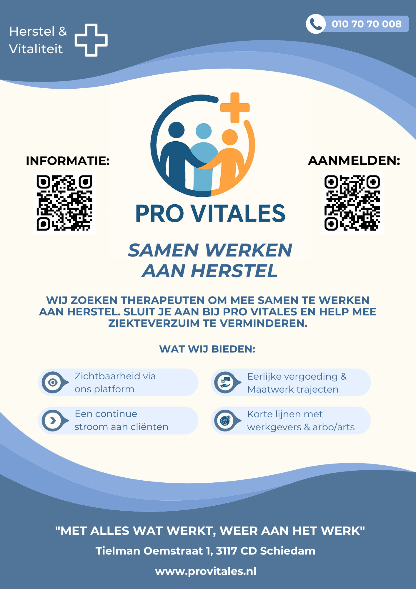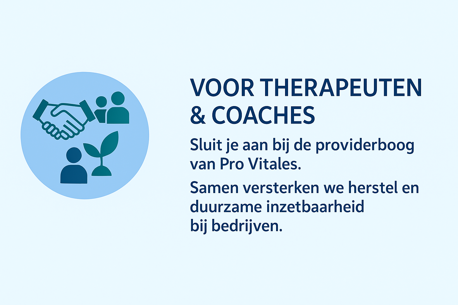 Stichting Pro Vitales biedt therapeuten en coaches de mogelijkheid om mensen te helpen tegen een goede vergoeding. Dit zodat medewerkers zelf, eventueel in overleg met hun werkgever of Arbo-arts, de juiste therapeut of coach kunnen kiezen.
