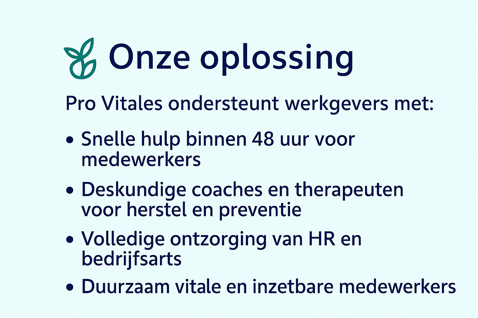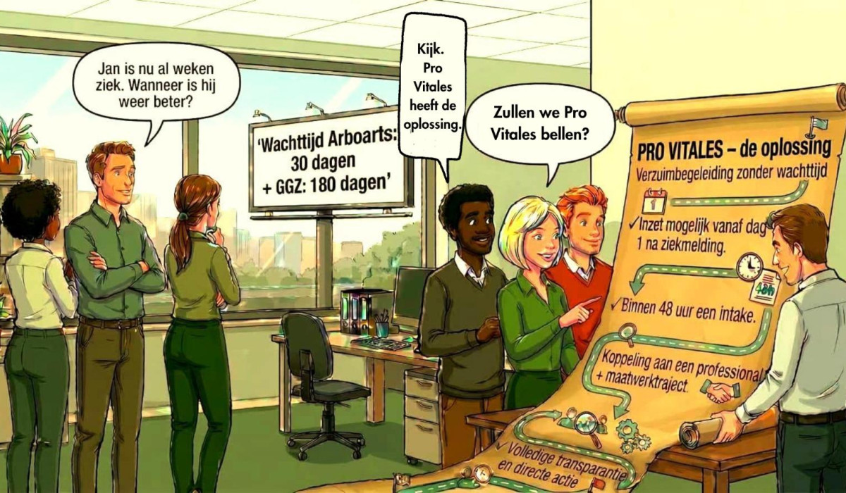 Een belangrijke plicht als werkgever is om je zieke medewerkers goed en snel te ondersteunen. Pro Vitales ontzorgt jou, de HR medewerker én de Arbo-arts en zorgt dat iedereen krijgt wat hij of zij nodig heeft. Met onze providerboog van deskundige en gecertificeerde professionals, therapeuten, coaches en leefstijlprofessionals zorgen wij dat medewerkers direct passende hulp krijgen. Onze aanpak richt zich op herstel, preventie en duurzame inzetbaarheid.