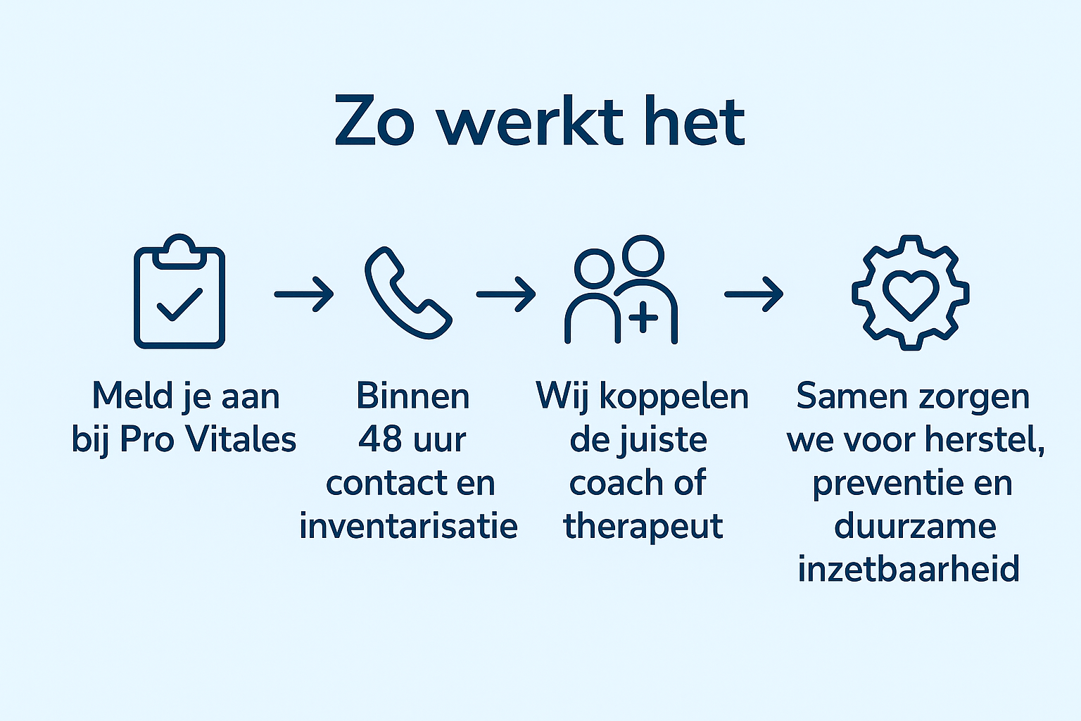 Sluit je kosteloos aan bij Pro Vitales en verkort het ziekteverzuim met behulp van onze coaches, therapeuten, GZ Psychologen en andere professionals .